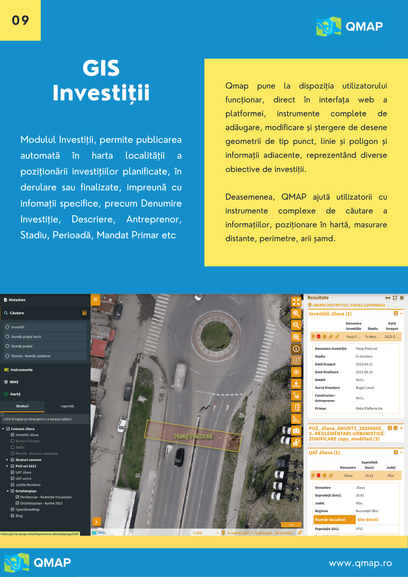 Corelat cu Legea nr. 50/1991 privind autorizarea executării lucrărilor de construcții și Legea nr. 273/2006 privind finanțele publice locale. Platforma QMAP oferă un sistem unitar de evidență geospațială pentru proiectele de investiții, monitorizarea stadiilor de execuție și corelarea cu rețelele de utilități și planurile urbanistice aprobate.