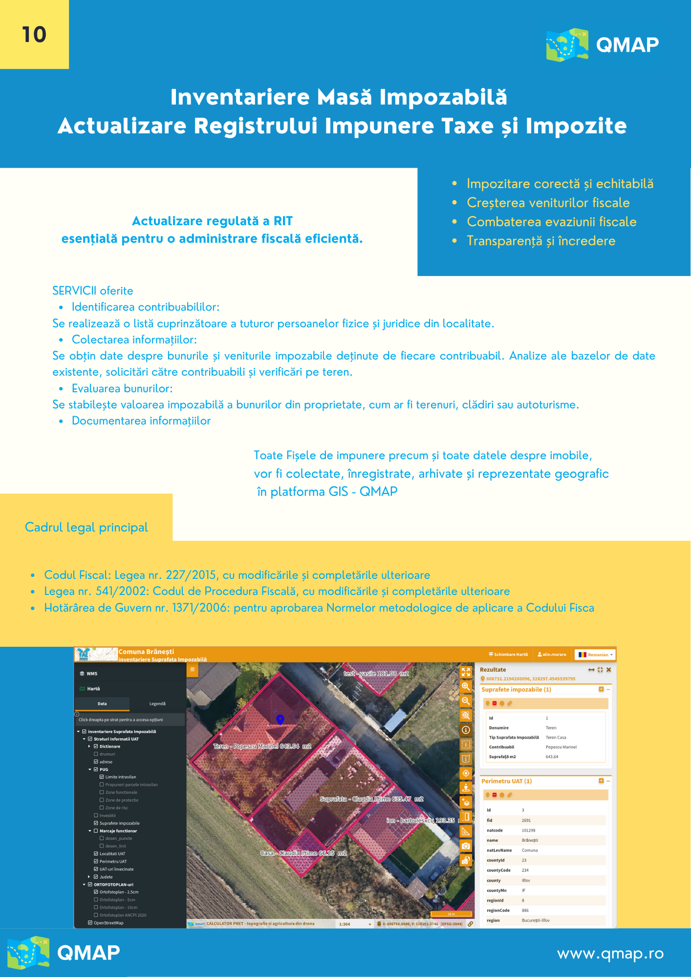 Bazat pe Codul Fiscal – Legea nr. 227/2015 și Hotărârea nr. 1/2016 privind normele de aplicare. Sistemul QMAP facilitează calculul masei impozabile prin corelarea datelor cadastrale și urbanistice cu evidențele fiscale locale, contribuind la o administrare fiscală precisă și transparentă.