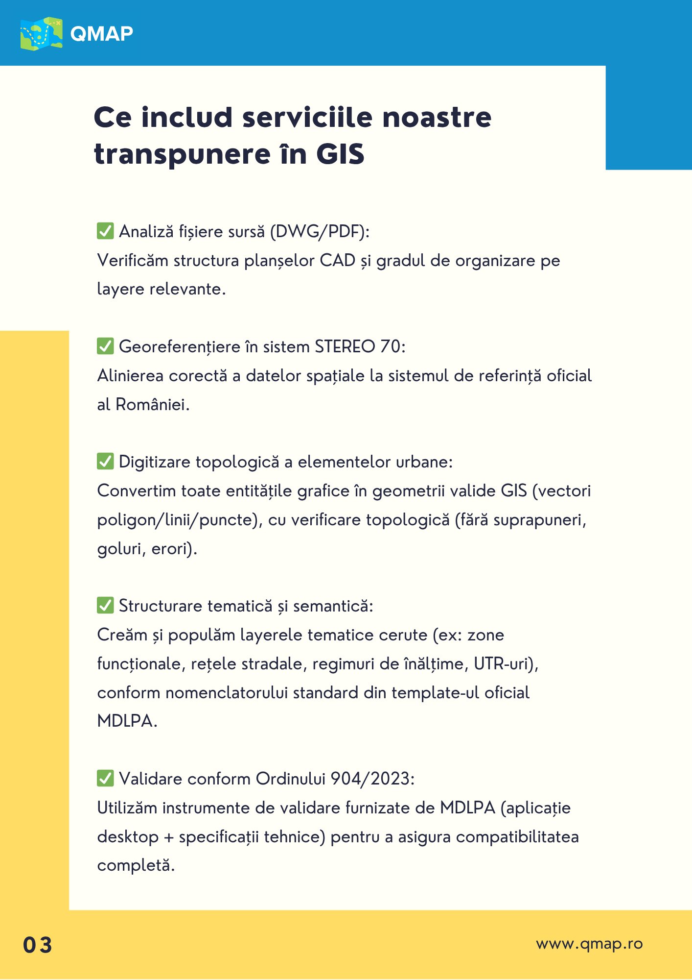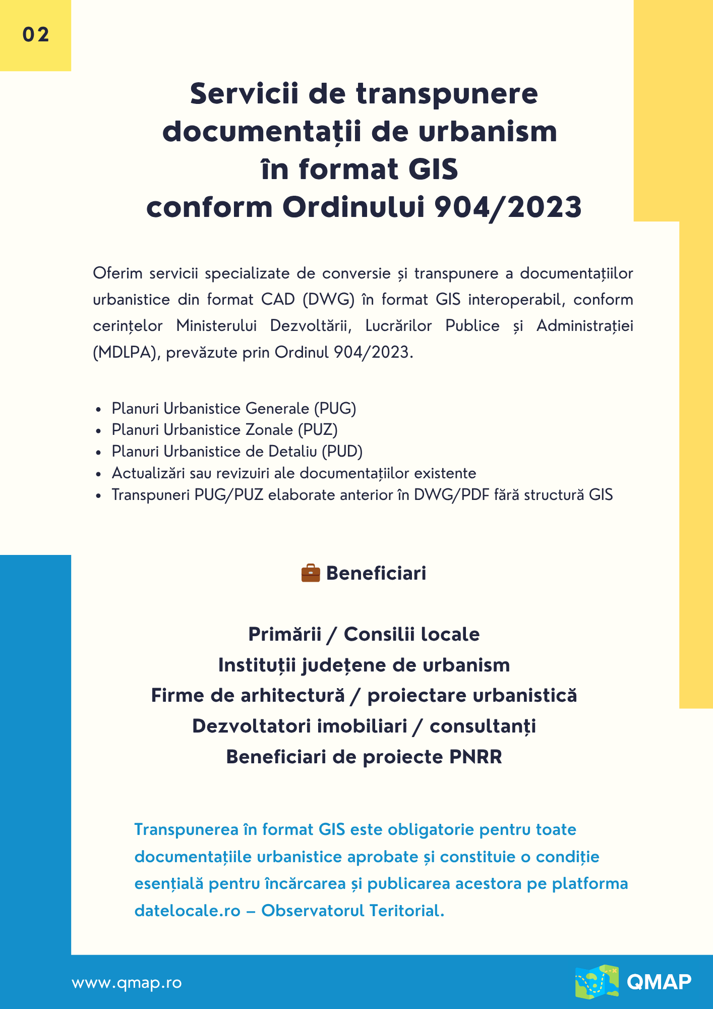 În conformitate cu Ordinul MDRAP nr. 233/2016 privind structura datelor spațiale din documentațiile de urbanism și amenajarea teritoriului. Serviciul asigură transformarea planșelor PUG, PUZ și PUD din format CAD, PDF sau analogic în format GIS interoperabil, cu stratificare tematică, georeferențiere precisă și metadate conforme cu standardele Ministerului Dezvoltării.
