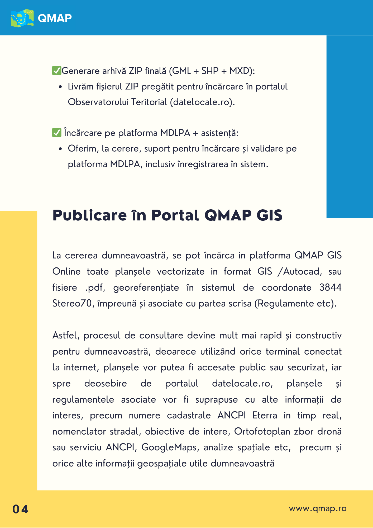 QMAP Portal GIS furnizează administrațiilor publice și operatorilor economici o suită completă de servicii dedicate digitalizării teritoriale și gestionării datelor geospațiale. Platforma integrează instrumente moderne de conversie, administrare și analiză a informațiilor urbanistice, cadastrale și de mediu, în conformitate cu legislația națională și standardele tehnice în vigoare.